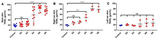 The experimental results for TEWL measurements of the back showed identical results from three different sites including left flank, right flank and upper back. A significant increase of TEWL values from 20 g/m2/h to approximately 80 g/m2/h was observed starting from day 4 of IMQ application. This result indicates the disruption of the epidermal barrier caused by psoriasis overtime. Likewise, the TEWL measurements for the right ear (treated with IMQ) showed a significant increase, whereas, the TEWL values for the left control ear (without IMQ) did not increase statistically during all the experimental days (Figure 6).