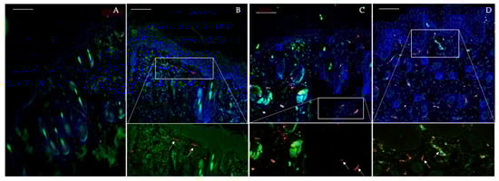 Endothelial markers evaluation in the course of IMQ-induced psoriasis-like dermatitis. Day 2 (A), Day 4 (B), Day 6 (C) and Day 8 (D). Blood vessels are presented in red indicating CD31, endothelial cells in green indicating CD34 and cell nuclei in blue by DAPI. Scale bar = 100 µm.