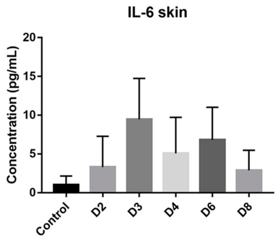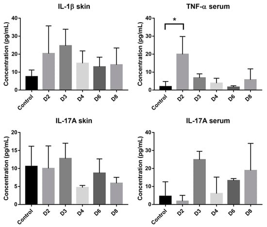 Cytokines concentration in both skin and serum samples. Data are presented as mean ± SD and statistically analyzed using one-way ANOVA followed by Tukey’s multiple comparison test. Only TNF-α level in serum at day 2 is significantly different from control. *: p < 0.05 (n = 3, except for control where n = 4).