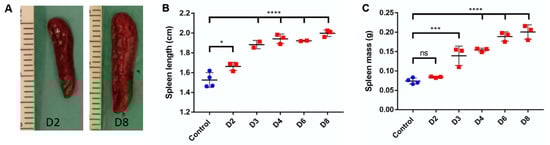 Following the euthanasia of mice, the spleens were carefully removed. Apart from visual examination, the length of each spleen was determined using a scale in cm and the spleen weight was recorded in g using a digital balance (AE163, Mettler, Columbus, OH, USA).
