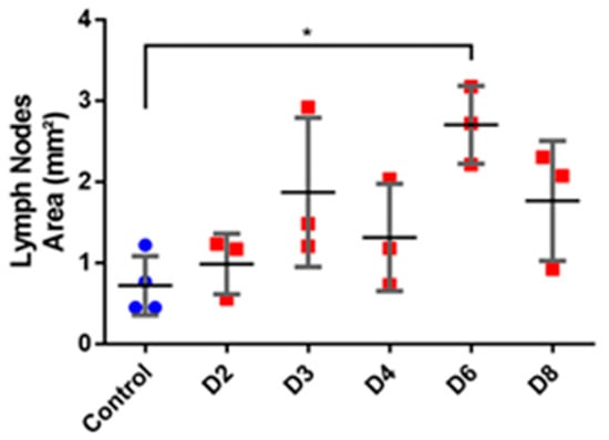 The images of all stained lymph nodes were then analyzed using ImageJ software. The measurements of the area, length and width of each lymph node was made and compared n = 3 for experimental group of each day and n = 4 for control group and statistically analyzed by one-way ANOVA followed by Dunnett multiple comparison post hoc analysis. The number of germinal centers for each lymph node was also noted. One representative image was selected for each day.
