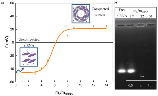 With respect to the electric charge, the anionic character of siRNA molecules is an important drawback to overcome since the cellular membrane is also negatively charged. The composition of the lipoplex at which its net charge changes from negative to positive, the so-called electroneutrality value, is a key information, since it marks the lower limit from which a lipoplex is potentially a suitable vector, strictly speaking from the point of view of the charge. Probably, the physico-chemical properties that allow us to obtain the electroneutrality value more accurately are either the electrophoretic mobility or the ζ potential, measured as a function of the ratio (at constant siRNA concentration), as reported in Figure 1a for C3(C16His)2/MOG-siRNA lipoplexes. These plots usually show a sigmoidal profile with three zones (see schemes included in Figure 1a): (i) the zone of net negative charge, where there is an excess of anionic siRNA molecules; (ii) the electroneutrality region that contains the electroneutrality ratio, i.e., the value in which lipoplexes have a net ζ (and, accordingly, the surface charge) equal to zero; and (iii) the zone of net positive charge, where there are cationic lipoplexes with the siRNAs already compacted, and usually in the presence of an excess of cationic liposomes when the ratio is high. A Boltzmann-type fit of the data in Figure 1a allowed us to determine the electroneutrality ratio of the lipoplexes at a . Using the protocol fully described previously [56,64], the electroneutrality ratio was used to determine the effective charge of C3(C16His)2, which was , a 30% lower than the nominal one (+2). This decrease has been attributed to the delocalization of the electric charge along the aromatic rings of the functionalized histidine residues, although other factors such as the packing density of the lipid chains have been reported to influence on the protonation state of the lipid [65]. This effect has also been observed in lipoplexes formed by the lipid mixture C3(C16His)2/DOPE and pDNA [26] and in others lipoplexes that contain GCL lipids bearing the imidazolium ring in their structure [56,66]. By contrast, the effective charge of siRNA is considered to be the same as its nominal one (), as reported in the literature for either linear DNA (with thousands of base pairs, as calf thymus or salmon sperm DNA) [56,57,58] or short RNAs (with 19–25 bp) [38,67]. Considering these results, it can be concluded that the formation of lipoplexes is mainly driven by electrostatic forces between the oppositely charged cationic lipid and the anionic siRNA molecules. There is also an important entropic factor associated with the release of Na+ counterions to the bulk solution when the lipoplex is formed [58,67,68]. The values of the effective charges allow us to work with effective charge ratios (ρeff) in the subsequent experiments: