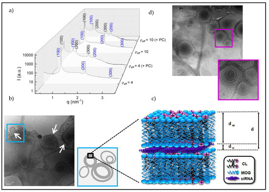 Once the C3(C16His)2/MOG mixture was confirmed to compact adequately siRNA molecules, it was convenient to gain insight into the structure and aggregation pattern of the lipoplexes, another factor of critical importance for a successful transport, cell uptake, and delivery of the cargo materials inside the cells. In this regard, SAXS and cryo-TEM techniques have already revealed their power, mostly when they are used together. SAXS diffractograms (plots of intensities vs. the momentum transfer vector, q) were obtained for C3(C16His)2/MOG-siRNA lipoplexes at ρeff = 4 and 10, and are collected in Figure 2a. These ρeff values were chosen to assure a good compaction level of the siRNA (ρeff > 1, see Figure 1b) and also because they were tested with successful results in other nanocarriers of pDNA or siRNA previously reported by us [26,43]. As can be observed in Figure 2a, the Bragg peaks can be correlated with the Miller indexes of a lamellar Lα lyotropic liquid crystal phase ((hkl) = (100), (200) and (300)) in both conditions (blue labels in Figure 2a). This multilamellar arrangement can be interpreted as a sandwich-type structure with alternating bilayers of C3(C16His)2/MOG mixed lipid and an aqueous layer between each pair of lipid bilayers, where the siRNA molecules with their counterions are located. Cryo-TEM experiments, also run for the lipoplexes at ρeff = 10, confirmed the multilamellar arrangement found in SAXS diffractograms, as shown in the micrograph reported in Figure 2b as an example. One can observe in this micrograph an appreciable population of nanostructures with the walls clearly thickened and deformed (see arrows in the figure), revealing how the presence of siRNA induces liposome aggregation to form cluster-type lipoplexes. Figure 2c shows a chart of a zoom view of this aggregation pattern and a scheme of the overall lamellar Lα phase. The same multilamellar pattern was found in a previous study where C3(C16His)2 was combined with DOPE to transfect pDNA [26]. However, this contrasts with the bicontinuous lyotropic liquid crystal cubic phases found by us for lipoplexes constituted by siRNA and a lipid mixture of an arginine-based cationic lipid and MOG [43]. Nanotube- or ribbon-type structures, found in some lipoplexes constituted by pDNAs and a lipid-based nanovector with amino acid residues in its structure [17,53] associated with low or zero levels of transfection, were not observed herein. As indicated in the scheme included in Figure 2c, the interlamellar distance (d) of the Lα phase (also known as the periodicity of the structure) can be expressed as the sum of the thicknesses of the lipid bilayer (dm) and the aqueous layer (dw). SAXS experiments allowed us to determine d from the q factors at which the Bragg peaks are found in the diffractograms (, where n is the scattering order), as summarized in Table 1. As seen in this table, the interlamellar distance is not affected by the lipoplex composition (ρeff). Thus, an average value of (6.1 ± 0.3) nm has been obtained, in agreement with those found for other multilamellar lipoplexes previously reported [18,26]. On the other hand, dm was estimated around 4.5 nm from cryo-TEM micrographs where liposomes were found (see Figure 2d, as an example) and also with Tanford’s model [69,70,71]. Thus, dw was calculated (= d − dm) around 1.6 nm, a thickness suitable for the accommodation of siRNA in between cationic lipid bilayers [38,72].