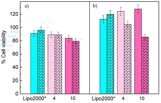 To consider whether the formed lipoplexes can be useful as nanovectors for siRNA delivery into cells and their use in prospective in vivo applications, they must fulfill a series of conditions such as biocompatibility with cells and tissues, and controlled release of their cargo at the site of action, among others. In order to test the potential cytotoxicity of the present lipid-based nanocarriers, a preliminary evaluation of the in vitro cell viability of two different cancer cell lines in the presence of C3(C16His)2/MOG-siRNA lipoplexes at ρeff = 4 and 10 was done by means of the CCK-8 proliferation assay. Figure 3 shows the % of cell viability of HeLa-GFP (a) and T731-GFP (b) cells after 48 (unstriped bars) and 72 h (striped bars) of incubation in the presence of the different formed lipoplexes. Non-treated cells were considered as the negative control (100% of cell viability), and cells treated with the commercial transfecting reagent Lipo2000* were considered as the positive ones.