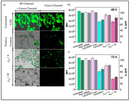 Flow cytometry analysis was carried out to make a quantitative analysis that confirms the trends observed with epifluorescence images. Figure 4 shows MFI (unstriped bars) and % GFP (striped bars) values of HeLa-GFP cells obtained at 48 (Figure 4b) and 72 h (Figure 4c) post-incubation with Lipo2000*-antiGFP-siRNA (positive control, blue bars) and C3(C16His)2/MOG-antiGFP-siRNA lipoplexes (at ρeff = 4, light pink bars, and ρeff = 10, dark pink bars). Free added antiGFP-siRNA (gray bars) and a non-targeting siRNA sequence compiled to Lipo2000* (Lipo2000*-non, purple bars) were used as additional controls. From Figure 4, it is clear that there was need for a vector-assisted delivery strategy to protect siRNA from nuclease degradation in the biological environment in order to exert its knockdown activity, as confirmed by the absence of any sign of decrease in MFI and % GFP values in these GFP-overexpressing HeLa cells (untreated cells, green bars) after administration of free antiGFP-siRNA. Also, the reduction of the MFI (or % GFP value) was a consequence of the antiGFP-siRNA sequence, since the cells treated by the non-targeting siRNA showed the same values of MFI or % GFP as the untreated ones. It is also remarkable in Figure 4 that there is a relatively noticeable knockdown activity of C3(C16His)2/MOG-siRNA lipoplexes formed at ρeff = 10 after 48 h of incubation, with decreases of ca. 33 and 20% in MFI and % GFP, respectively (Figure 4b), which are rather similar to those obtained with the standard Lipo2000* control. Conversely, the inhibitory effect of lipoplexes formed at ρeff = 4 was less intense, with reductions around 8–12% for both quantities. At longer incubation times (72 h), the gene silencing effect was much more intense (Figure 4c). Silencing activities of ca. 25 and 17% in MFI and % GFP, respectively, were detected for C3 (C16His)2/MOG-siRNA lipoplexes formed at ρeff = 4, while these values increase to 66 and 57% at ρeff = 10. For the latter, the achieved knockdown activity is almost two-fold larger compared to that of the Lipo2000* positive control.