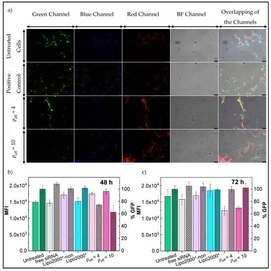 Additionally, with the aim of assessing the potential gene knockdown activity of these cell-friendly gene nanocarriers, epifluorescence microscopy was used to monitor the fluorescence signal changes from overexpressed GFP in both cancer cell lines (HeLa-GFP and T731-GFP) upon 72 h of incubation of the lipoplexes in HS-supplemented culture medium, which favors the PC formation around lipoplexes. For HeLa-GFP cells (Figure 4a), green channel and merged (green and bright field channels) images were used to locate and analyze the GFP expression. From these images, no significant differences in the GFP fluorescence levels between the positive control Lipo2000*-antiGFP-siRNA (row 2) and the lipoplexes formed at ρeff = 4 (row 3) were detected; moreover, relevant decreases in GFP fluorescence were observed (higher knockdown activity) for those lipoplexes formed at ρeff = 10 (row 4). ImageJ software was used to make a semi-quantitative estimation of the silencing activity of the lipid-based nanocarriers by measuring the remaining GFP fluorescence intensity after treatment. In this regard, values of 57, 68 and 12% of the initial fluorescence shown by non-treated cells were obtained for the Lipo2000*-antiGFP-siRNA control and lipoplexes formed at ρeff = 4 and 10, respectively. Similar % GFP values were found in additional images analyzed (Figure S1).