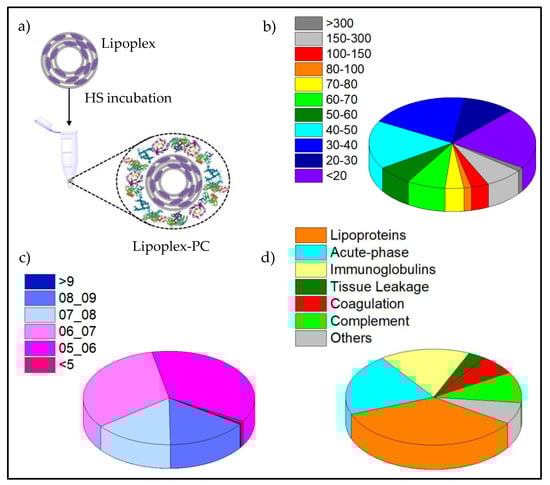 (a) Scheme depicting protein corona formation (PC). Percentage of the proteins found within the protein corona (PC) of C3(C16His)2/MOG-siRNA lipoplexes at α = 0.2 and ρeff = 10, classified by their molecular weight, MW in kDa (pie chart b), by their isoelectrical point, pI (pie chart c) and by their physiological function (pie chart d).