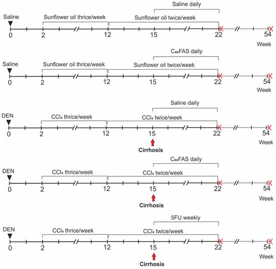 The scheme of the experiment. Experimental groups were as follows (from top to bottom): Control (n = 16); C60FAS (n = 16); HCC (n = 16); HCC + C60FAS (n = 16); HCC + 5FU (n = 16). Doses and solvents: DEN—200 mg/kg in saline (total volume 0.1 mL), CCl4—1 mL/kg in sunflower oil (total volume 0.2–0.7 mL depending on body weight), C60FAS—0.25 mg/kg (0.3–0.6 mL depending on body weight), 5FU—15 mg/kg in saline (total volume 0.1 mL), saline—0.1 mL (instead of DEN and 5FU) or 0.3–0.6 mL (instead of C60FAS), sunflower oil—0.2–0.7 mL (instead of CCl4). Halves of each group were sacrificed in 22 weeks from the start of experiment (the first crosses), other halves were left for survival, and animals that were still alive were sacrificed in 54 weeks from the start of experiment (the second crosses).