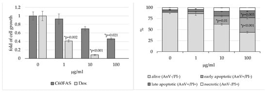 HepG2 cell viability after 48 h cultivation in medium contained C60FAS or Dox as a reference (left panel) and distribution according to alive, apoptotic and necrotic cell pools after 48 h cultivation in medium contained C60FAS (right panel); * compared to respective control (p-values provided if p < 0.1).