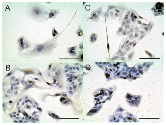 Vimentin and p53 expression in HepG2 cells after 48 h cultivation in medium contained 10 µg/mL C60FAS: (A): vimentin expression, control; (B): vimentin expression, C60FAS; (C): p53 expression, control; (D): p53 expression, C60FAS; hematoxylin, ×400, scale 100 µm.