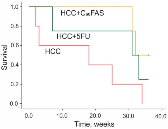 Kaplan–Meyer post-treatment survival curves for HCC-experienced animals treated by 5FU and C60FAS.