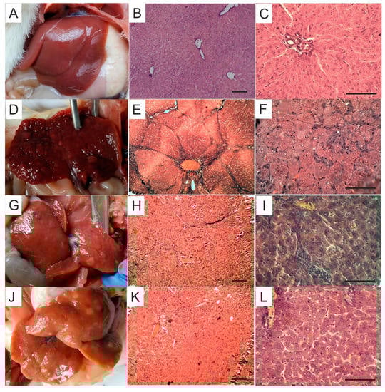 Representative rat livers at the time of the sacrifice (A,D,G,J) and H&E staining of liver tissue, magnification ×100 (B,E,H,K), scale 200 µm, and ×400 (C,F,I,L), scale 100 µm: (A–C)—control; (D–F)—HCC; (G–I)—HCC + 5FU; (J–L)—HCC + C60FAS.