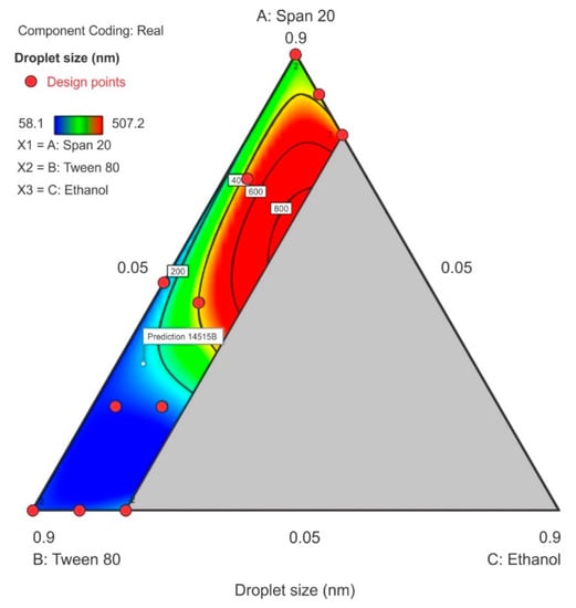 Surfactant-mixture optimization studies were performed using a D-optimal design to elucidate the effect(s) of the proportion of individual components of the surfactant mixture viz. Span® 20, Tween® 80 and ethanol content on droplet size, PDI and ZP. The D-optimal design studies were performed with the aid of Design-Expert version 12.0 software (Stat-Ease, Inc., Minneapolis, MN, USA). The proportion of oil in the nanoemulsion was maintained at 10% v/v for dilution-line 9, which falls in the nanoemulsion region. Span® 20, Tween® 80 and ethanol were independent variables and droplet size, PDI and ZP were the responses monitored. The oral route of delivery is proposed for these nanoemulsions, therefore the proportion of ethanol used was maintained at the permissible levels for food content with the largest concentrations at 20% m/m [35,36,37]. Legislation relating to the use of ethanol as an excipient in pediatric medicines or drugs is different in different countries and the American Academy of Pediatrics recommends that ethanol content in pediatric drugs should not produce a blood concentration >25 mg/100 mL following administration of a single recommended therapeutic dose. The dose size of EFV is 200 mg for pediatric patients and 600 mg for adults and as a nanoemulsion the dose unit is relatively small and is not expected to produce blood ethanol levels above regulated limits [38]. The European Medicines Agency (EMA) recommends a daily limit of 260.5 mg/kg/day of ethanol [39]. The levels for Span® 20 (A), Tween® 80 (B) and ethanol (C) used in the mixture fell in the range between the minimum and maximum levels listed in Table 2 with the sum of the components A, B and C always totaling 100%.