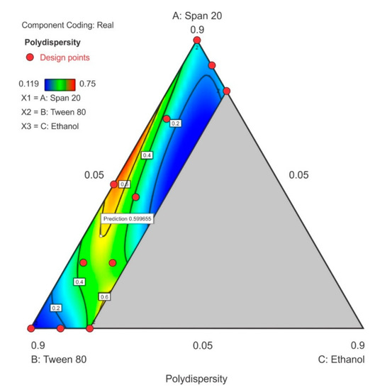 The PDI ranged between 0.119 to 0.75 in the design space with the highest PDI observed at the center-point for Tween® 80 and Span® 20 content with ethanol content used closest to the lower limit. As the ethanol content was increased in the upper region of the contour plot towards the Span® 20 vertex, a general decrease in PDI is observed as depicted in (Figure 7). The model F-value of 86.11 indicates that the special quartic model for PDI was significant and that there is only a 0.01% chance that a model F-value this large was due to noise. A p-value of <0.05 implied that the coefficients of effect and relationship of the model terms A, B, C, AB, AC, BC, A2BC, AB2C and ABC2 were significantly different from zero and could be estimated and the ANOVA data and results for this special quartic model are given in Table S4 of the Supplementary Material. The model equation in terms of coded factors for PDI is reported as Equation (2). The predicted R2 0.8335 is in reasonable agreement with the adjusted R2 0.9789. The lack of fit F-value 0.08 implies that lack of fit was not significant for the model and that there is a 56.02% chance that the lack of fit F-value this large is due to noise.