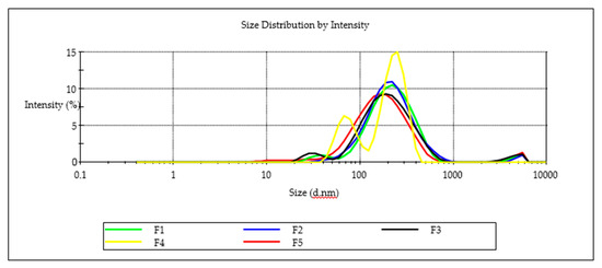 Particle-size distribution for batches F1, F2, F3, F4 and F5.