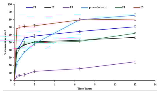 In vitro release testing revealed burst release of EFV for batches F1, F2, F4, F5 and for pure EFV within the first two hours of commencement of testing. Dissolution testing was conducted for the formulations listed in Table 6 and the % EFV released was based on actual drug loading data generated following assay of the nanoemulsion formulations. The nanoemulsion for batch F5 exhibited the greatest extent of release at 12 h that decreased for batches F1, F4, F5 and F3 which exhibited a sustained release effect and the release profiles are depicted in Figure 11. The reduction in amount of EFV released from the nanoemulsions may be attributed to solubilization of EFV in droplets of the nanoemulsion and/or formation of the EFV solvate on crystallization. Drugs may precipitate in vitro and in vivo due to a rapid change in pH, dilution with body fluids or digestion of solubilizing excipients subsequently resulting in lower EFV concentrations within the aqueous phase and better entrapment of EFV within the crystal lattice structure. As the saturation method of manufacture was used to produce the nanoemulsions, following supersaturation the process of nucleation continues and promotes crystallization [62,63]. As the proportion of ethanol is increased, the percent efavirenz released at 12 h decreases. On interaction with 1% m/v SLS in 0.1-M HCl dissolution fluid, the nanoemulsion formulations crystallized and formed a white edged crystalline semisolid that sank to the bottom of the dissolution vessel. Nanoemulsions of batch F4 and F5 were prepared with the same amount of ethanol and different proportions of Tween® 80 and Span® 20 and batch F5 released a larger amount of EFV than batch F4 at 12 h possibly due to the different hydrophilic lipophilic balance (HLB) value of the surfactants used. Tween® 80 is soluble in an aqueous environment, whereas Span® 20 is not and therefore Tween® 80 interacts with the dissolution medium and contributed to better dissolution of EFV. Crystallization was observed for all batches and was greatest for batch F3. EFV precipitation is an undesirable outcome following administration of SNEDDS formulations. The loss of ethanol as observed with FT–IR analysis following dissolution testing may be the largest contributing factor to a reduced solubilization capacity and increased rate of nucleation in the supersaturated nanoemulsion formulations and hybridization of the C–H bond stretch that reduces the hydrophobicity of the formulation thereby affecting the interaction of EFV to form a solution.