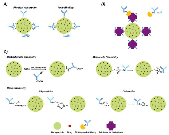 This phenomenon is a non-covalent immobilization strategy that comprises physical adsorption and ionic binding [46] (see Figure 1A). Physical adsorption occurs via weak interactions such as hydrogen bonding, electrostatic, hydrophobic and Van der Waals attractive forces [47], while ionic binding occurs between the opposite charges of the antibodies and NP surfaces [48]. However, when compared to other methodologies such as covalent binding, adsorption provides less stability [49]. On the other hand, the fact that the interaction is non-covalent may allow release of the antibody in the tumor tissue, allowing deploy of its antitumoral properties. In this regard, three modified methodologies of functionalized PLGA NPs with trastuzumab were generated via adsorption, charged interactions and covalent binding. The results obtained via covalent binding demonstrated its higher stability versus charge interactions and adsorption [50].