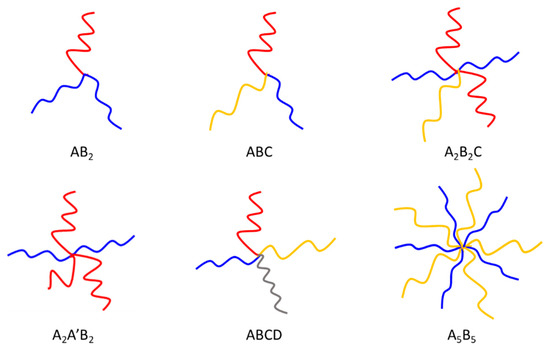 One of the more fascinating and advantageous approaches to improving polymer-based drug delivery has come from adjusting the architecture of polymeric backbones. Miktoarm polymers (sometimes known as heteroarm star polymers) are a class of star polymers with asymmetric branching in which at least three branching strands originate from a shared core [18,19]. Their compositions differ from slight variations in molecular weight, to having completely different repeating units and chemical configurations. Due to their asymmetry, miktoarm variants are categorized in the form: AxByCz, where A, B, and C are examples of polymeric chains, and the subscript denotes their number (Figure 1). The branching architectures of miktoarm polymers have contributed distinct properties to their aqueous self-assemblies, compared to those from their linear diblock copolymer counterparts, including very low CMCs, smaller sizes, and most importantly the ability to encapsulate large amounts of drug molecules [20,21,22,23,24,25]. In addition, the tunability offered by having multiple branching segments has led to the synthesis of a variety of micelle structures that incorporate polymeric arms with stimulus-responsive units and biological targeting moieties. These are in addition to conferring aqueous solubility and maintaining micelle stability. Table 1 below provides a brief summary, in chronological order of their discovery, of the different types of miktoarm polymeric architectures and their assemblies, used for the delivery of a variety of pharmaceutics [21,25,26]. It shows the diversity in their composition, and the potential of targeting these formulations to desired sites through the introduction of various stimuli.