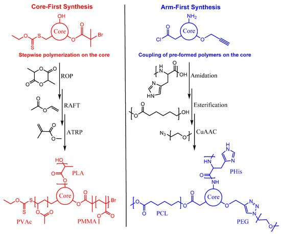 Examples of core-first synthesis (left) and arm-first synthesis (right) with examples of functionalities, monomers, and polymers.