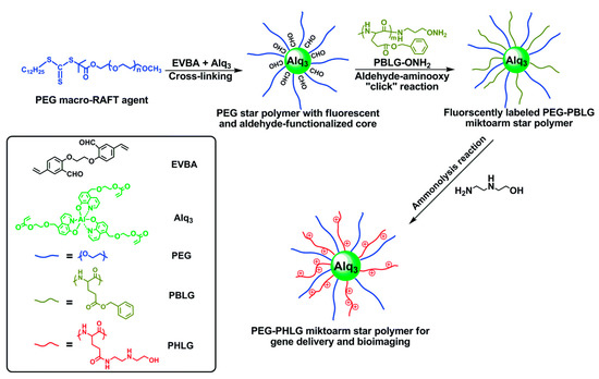 To our knowledge, there is one example of a CCS miktoarm star that has been evaluated for drug delivery. Trithiocarbonate-terminated polyethylene glycol (PEG-DMPA), a PEG-based RAFT macroinitiator, was synthesized from α-methoxy-ω-hydroxy PEG. It was core crosslinked with 6,6′-(ethane-1,2-diylbis(oxy))bis(3-vinylbenzaldehyde) (EVBA), a divinyl linker with pendant aldehyde functionalities, in the presence of aluminum tris(8-hydroxyquinoline) (Alq3), a fluorescent crosslinker, to yield a CCS with PEG arms, short aldehyde pendants, and a crosslinked fluorescent core. The aldehyde groups were used to couple with aminooxy end-functionalized poly(γ-benzyl-L-glutamate) (PBLG), a polypeptide, through the aldehyde-aminooxy click reaction. After an aminolysis step with β-hydroxyethylenediamine, the PBLG arms were converted to poly(β-hydroxyethylenediamine-L-glutamate) (PHLG), which is cationic at physiological pH (Figure 3). The resulting charged miktoarm polymers were found to be biocompatible and were able to bind siRNA through electrostatic interactions. Due to their surface charge, the miktoarm polymers were easily taken up by cancer cells where they could deliver their siRNA cargo. At the same time, the fluorescent miktoarm cores provided efficient tracking [61].