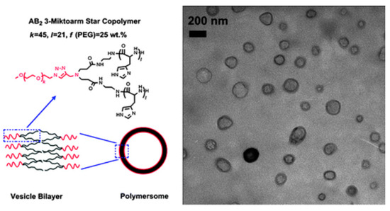 Cartoon schematic (left) and comparative TEM micrograph (right) of a polymersome assembled from a PEG-PHis2 miktoarm star polymer with emphasis on its hydrophobic bilayer. Reprinted with permission from reference [43]. Copyright 2012 Royal Society of Chemistry.