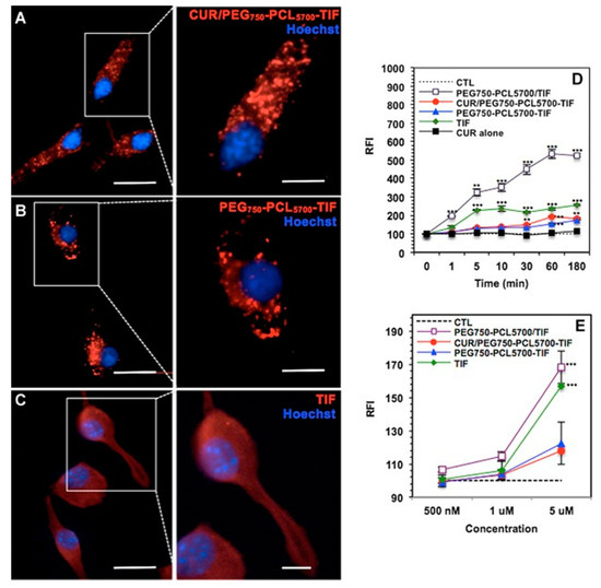 Fluorescent micrographs of macrophages treated with (A) curcumin-loaded PEG-PCL-TIF micelles, (B) unloaded PEG-PCL-TIF micelles, and (C) TIF control. Relative fluorescence intensities of macrophages treated with control media, TIF-loaded PEG-PCL micelles, curcumin-loaded PEG-PCL-TIF micelles, unloaded PEG-PCL-TIF micelles, free TIF, and free curcumin as a function of (D) treatment time and (E) dose concentration. Scale bar = 20 μm, inset scale bar = 10 μm. Statistically significant differences are represented by ** (p < 0.01), and *** (p < 0.001). Reprinted with permission from reference [49]. Copyright 2014 John Wiley and Sons.