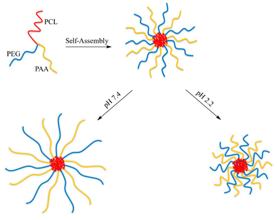 A series of ABC (A = PEG, B = PCL, C = PAA) star polymers that would assemble into micelles with hydrophobic cores and mixed PEG/PAA hydrophilic coronae with pH sensitivity imparted by PAA (Figure 7), have also been synthesized [56]. At low pH, the COOH group on the backbone of PAA arms became increasingly protonated and resulted in hydrogen-bonding complexation with PEG arms in micellar coronae, and a decrease in micelle size. In the pH range from 6 to 10, PAA arms became progressively ionized, and formed larger swollen micelles, from the loss of PEG/PAA corona complexation and repulsive forces between adjacent PAA arms. The average particle size increased from 51 to 154 nm at pH 2.2 to 10. The ABC miktoarm polymers had 58–73% encapsulation of naproxen, a model hydrophobic drug, and its cumulative release from the ABC miktoarm star micelles was 65–89% over 24 h, at pH 7.4. Adjusting the pH to 2.2, and therefore, compressing the micelles, resulted in greater drug retention, with cumulative naproxen release coming to roughly 35–50%. This suggests that naproxen would be retained under gastric conditions and released in the intestine, making the micelles suitable for oral administration.