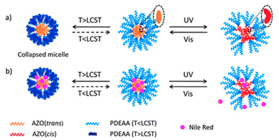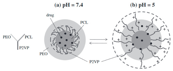 Schematic representation of the effect of (a) physiological pH and (b) acidic pH on the morphology of self-assembled PEG-PCL-P2VP micelles. Reprinted with permission from reference [29]. Copyright 2012 Elsevier.