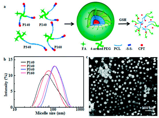 - Zhang, Y.; Chen, M.; Luo, X.; Zhang, H.; Liu, C.; Li, H.; Li, X. Tuning multiple arms for camptothecin and folate conjugations on star-shaped copolymers to enhance glutathione-mediated intracellular drug delivery. Polym. Chem. 2015, 6, 2192–2203. [Google Scholar] [CrossRef]