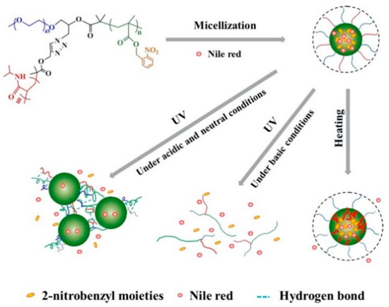 Taking advantage of poly(2-vinylpyridine) (P2VP), containing basic units with a pKa of roughly 5.9, a variety of pH-sensitive ABC-type (A = PEG, B = PCL, C = P2VP) miktoarm stars were synthesized [28,29,30]. Due to the presence of P2VP, these polymers formed micelles with positive (+12.5 mV) zeta potentials upon aqueous self-assembly, thus indicating the presence of protonated P2VP arms in the coronae alongside PEG. Deprotonation through NaOH addition resulted in a micelle diameter change from 54 to 37 nm, due to the collapse of P2VP branches into micelle cores. This was attributed to the unique architecture of the star polymers, as well as the loss of electrostatically repelling chains in the corona (Figure 8). A titration indicated that the pKa was 5.0, corresponding closely to that for P2VP, and was neutral at physiological pH [28]. In a follow-up study, P2VP blocks were biotinylated so that, upon administration, the labelled ABC micelles would contain biotin in the core [29]. Exposure to low pH in a tumor environment would protonate P2VP chains and shift conjugated biotin to the micellar corona, where it would aid in tumor targeting. Interestingly, the passive uptake effect of cationic micelles, due to electrostatic interactions with negatively charged cell surfaces is so effective that the inclusion of biotin was unnecessary for astrocyte and 9L cell internalization. Loading of micelles with Nile Red as a model hydrophobe verified their efficacy in drug delivery. While 24% sustained release was seen after 6 h at pH 7, an acidic pH 5, mimicking the endosomal environment, caused burst release with a cumulative release of 64% after 6 h.