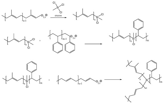 Hadjichristidis and coworkers were the first to prepare polymers with asymmetric branching based on an arm-first method using chlorosilane cores [82,83,84,85,86,87]. Dubbed “miktoarm” after the Greek word μικτός (miktos) or “mixed”, these polymers had a variety of branches emanating from a single core. More specifically, the first example of such a polymer was a construct made of polyisoprene (PI), polystyrene (PS), and polybutadiene (PB). Due to the increasing reactivity of the polymer anion termini in the order of PB > PI > PS, and the steric hindrance that follows the opposite trend, the miktoarm synthetic methodology was designed such that PI (with intermediate reactivity) would first be linked to a large excess of a chlorosilane core. Then, relying on the inability of the second PS arm to undergo complete reaction with PI-linked chlorosilane, PS was attached second, followed by excess PB, which would undergo complete exchange with the remaining Cl on the chlorosilane core (Scheme 1) [88].