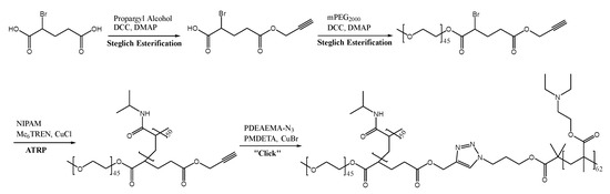 Most researchers rarely limit themselves to one type of conjugation or even only arm-first syntheses. Instead, arm-first and core-first methods are typically combined to attain the desired miktoarm star polymer. For example, both Steglich esterification and CuAAC coupling were combined with a core-first methodology. Propargyl alcohol and mPEG2000 were coupled to 2-bromoglutaric acid (BGA), in this sequence, through DCC/DMAP catalyzed Steglich esterifications to yield the desired PEG2000(-alkynyl)-Br macroinitiator. The latter was used for the ATRP of N-isopropylacrylamide (NIPAM) with tris(2-(dimethylamino)ethyl)amine (Me6TREN) and CuCl. Finally, azido-terminated poly(2-(diethylamino)ethyl methacrylate (PDEAEMA), prepared earlier through ATRP, was “clicked” to the alkynyl group of the PEG-PNIPAM diblock, using CuAAC coupling with N,N,N′,N″,N″-Pentamethyldiethylenetriamine (PMDETA) and CuBr, giving the ABC (A = PEG, B = PNIPAM, C = PDEAEMA) miktoarm star polymer (Scheme 4) [107].