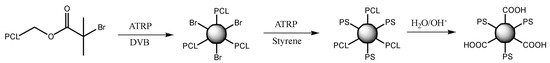 A similar study approached the idea of biodegradable CCS polymers, which included arm-degradable Ax, partially arm-degradable AxBy, and core-degradable By (A = PCL, B = PS/PMMA). Beginning with a bifunctional core, 2-hydroxyethyl 2′-methyl-2′-bromopropionate, which had both ROP and ATRP active ends, arm-degradable polymers were synthesized by the sequential ROP of CL, and core-crosslinking using DVB. This resulted in a PCL-CCS polymer, which could be degraded through hydrolysis. A non-degradable analogue was synthesized by using the initiator for the ATRP of MMA/St first, followed by DVB crosslinking. Most interestingly, however, was the capacity to make partially arm-degradable AxBy polymers using this approach [114]. This opens up the possibility of synthesizing miktoarm polymer-based drug delivery systems with tuned biological responses that can be adjusted to provide a good sustained release of drug cargo.