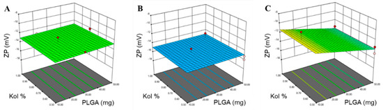 Response surface plots for the effect of the amount of PLGA (mg) and Kol % (w/v) on ZP using (A) PLGA-7K, (B) PLGA-24K and (C) PLGA-38K.
