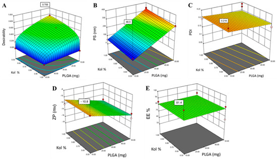 Optimization of PTX-PLGA-NPs showing response surface plots for the effect of using 10 mg PLGA-K38 and 0.5% Kol on (A) the desirability value, (B) PS (nm), (C) PDI, (D) ZP (mV) and (E) EE%.
