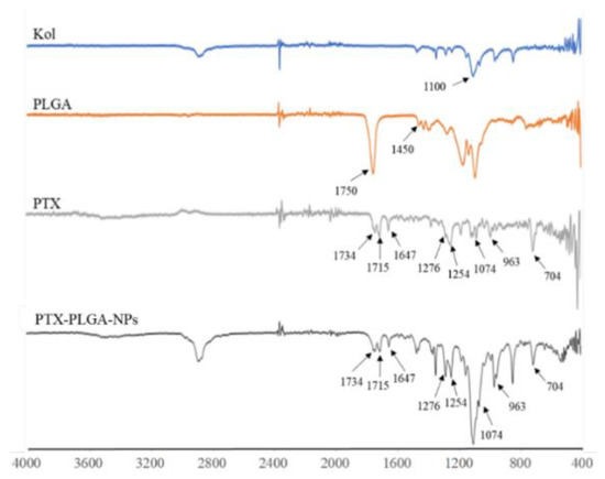 The potential interaction between the drug and the materials used in the fabrication of the NPs was assessed using FT-IR. The FT-IR spectra of PTX, PLGA, Kol and PTX-PLGA-NPs are depicted in Figure 7.