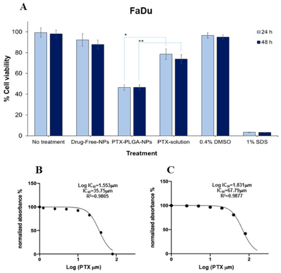 The chemotherapeutic efficacy of the drug was further investigated by measuring the IC50 of PTX-PLGA-NPs compared to the free drug solution in FaDu cells, as depicted in Figure 9B,C. Results showed that the optimized PTX-PLGA-NPs formulation had a significantly lower IC50 (35.75 μM) compared to the free drug solution (67.79 μM). Similarly, the IC50 of the optimized PTX-PLGA-NPs (41.21 μM) was significantly lower than that of the PTX-solution (51.19 μM) in CAL27 cells, confirming the ability of the optimal formulation to increase the therapeutic efficiency of PTX. This effect might be due to the enhanced cellular uptake of PTX when efficiently encapsulated in NPs with optimized PS and PDI.
