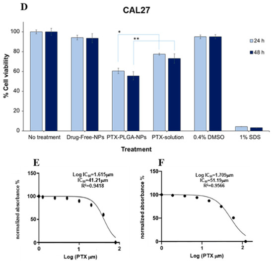 Determination of % cell viability (A) In vitro cytotoxicity results using FaDu cells treated for 24 h and 48 h; (B) Determination of IC50 for optimized PTX-PLGA-NPs and (C) free PTX solution using FaDu cells; (D) In vitro cytotoxicity results using CAL27 cells treated for 24 h and 48 h; (E) Determination of IC50 for optimized PTX-PLGA-NPs and (F) free PTX solution using CAL27 cells. * p < 0.05, ** p < 0.01.