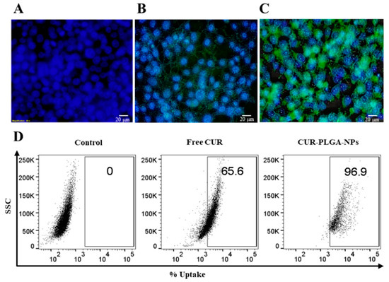 Cellular uptake studies in FaDu cells showing qualitative analysis of cellular localization (A) control (no treatment); (B) free CUR; (C) optimized CUR-PLGA-NPs (magnification 40×); and (D) quantitative analysis of cellular uptake by flow cytometry.