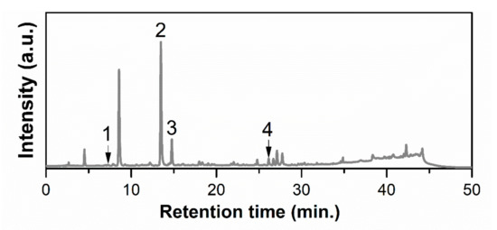 HPLC–PDA chromatogram of the Aronia extract at 326 nm (1, protocatechuic acid; 2, chlorogenic acid; 3, caffeic acid; 4, rutin hydrate).