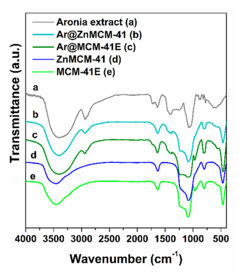 The mesoporous silica-type materials used for embedding the Aronia extract, MCM-41E, and ZnMCM-41 (12% wt ZnO determined by EDS) were chosen due to their high pore volume, in the range of 0.78–0.80 cm3/g (Table 3). The Aronia extract-loaded materials were characterized by FTIR spectra, TGA/DTA, and N2 adsorption–desorption isotherms.