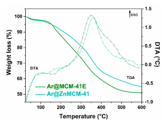 The FTIR spectra of the Aronia extract-loaded samples evidenced the presence of phytocompounds on the mesoporous silica-type supports through the bands associated with the stretching vibrations of C–H bonds (in the 2850–3000 cm−1 region) and C–O bonds (1732 cm−1 for the embedded extract and 1726 cm−1 for the polyphenolic extract). The bands assigned to the mesoporous silica-type supports were asymmetrical and symmetrical stretching vibrations of Si–O–Si bonds (1088 and 804 cm−1 for the MCM-41E support and 1084 and 798 cm−1 for ZnMCM-41, respectively), stretching vibration of silanol groups at 968 cm−1, and the deformation band of Si–O bonds at 468 cm−1, as well as the specific band of physiosorbed water molecules at 1638 cm−1 (Figure 2). The content of natural compounds in the extract-loaded samples, which was in the range of 42–43% wt (Table 3), was determined from the thermogravimetric analysis considering the weight loss up to 600 °C and after deducting the physiosorbed water associated with the first endothermic event on the DTA curve (Figure 3).