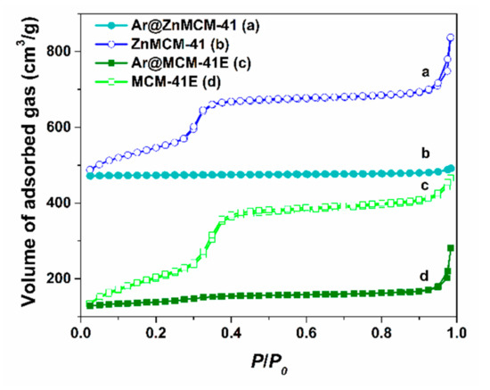 Nitrogen adsorption–desorption isotherms of Ar@ZnMCM-41 (b) and Ar@MCM-41E (d) in comparison to the corresponding ZnMCM-41 (a) and MCM-41E (c), respectively.