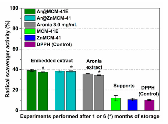 The RSA of black chokeberry-loaded materials was determined after 24 h of incubation in DPPH free radical solution under dark conditions, in duplicate, and compared to that of the free extract and the corresponding silica-type support in the same concentration as in the materials containing the extract, using the degradation of the DPPH free radical solution as the control. Considering that mesoporous silica-type supports have the ability to adsorb organic molecules (i.e., DPPH radicals) due to their high porosity, as well as the slow interaction between free radicals from the solution and a solid sample (antioxidant compounds encapsulated in a solid matrix), 24 h of incubation was determined as an optimum duration in the case of the embedded extract in a solid support [17]. In addition, the degradation of the DPPH solution over time was considered for the determination of the RSA for all samples. One can observe the preservation of RSA for the embedded extract, which was slightly higher than that of the free extract (Figure 5), while the mesoporous silica-type supports did not contribute to the RSA.