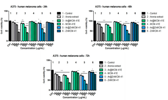 In vitro cytotoxicity evaluation of the A. melanocarpa (Michx.) Elliott. Extract (free or encapsulated in the silica-type matrices) and of the MCM-41 silica-type supports (10, 50, 100, and 250 µg/mL) on the A375 human melanoma cell line at 24, 48, and 72 h post-treatment by means of an MTT assay. The results are expressed as cell viability percentage (%) related to the control (i.e., the untreated cells). The data represent the mean values ± standard deviation (SD) of three independent experiments. One-way analysis of variance (ANOVA) followed by a Dunnett’s multiple comparison test was used for comparison among groups (* p < 0.05; ** p < 0.01; *** p < 0.001).