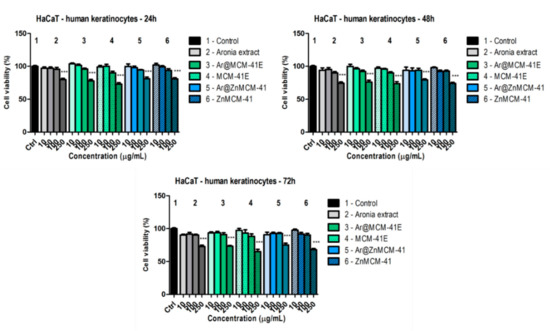 At 48 h post-treatment, a significant decrease in the viability of the HaCaT human keratinocytes was noticed at the highest tested dose, i.e., 250 µg/mL. The lowest value was obtained for the black chokeberry extract (cell viability was 74.4 ± 3.1% vs. the control); meanwhile, for Ar@MCM-41E at 250 µg/mL, the viability was 76 ± 4.8% vs. the control, and, for Ar@ZnMCM-41 at the same concentration, it was 79.3 ± 2.7% vs. the control. The MCM-41E carrier provoked, at the highest dose tested, a decrease in cell viability (73.7 ± 5.2%), with the ZnMCM-41 support showing a similar value (74 ± 2.8%).