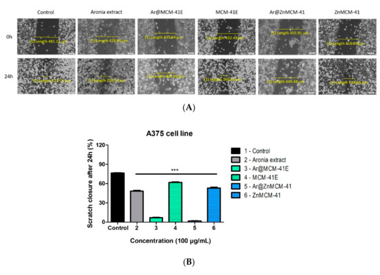 For the evaluation of the antimigratory effect of A. melanocarpa (Michx.) Elliott extract on A375 human melanoma cells, as well as the black chokeberry extract-loaded mesoporous silica-type matrices (i.e., Ar@MCM-41E and Ar@ZnMCM-41) and the MCM-41E and ZnMCM-41 matrices, a scratch assay was performed. The cells were treated with a concentration of 100 µg/mL from each sample and compared to the control (i.e., untreated cells). This concentration was used for evaluating the antimigratory potential because, at the highest tested concentration, the viability decreased, and the experiment could not be performed.