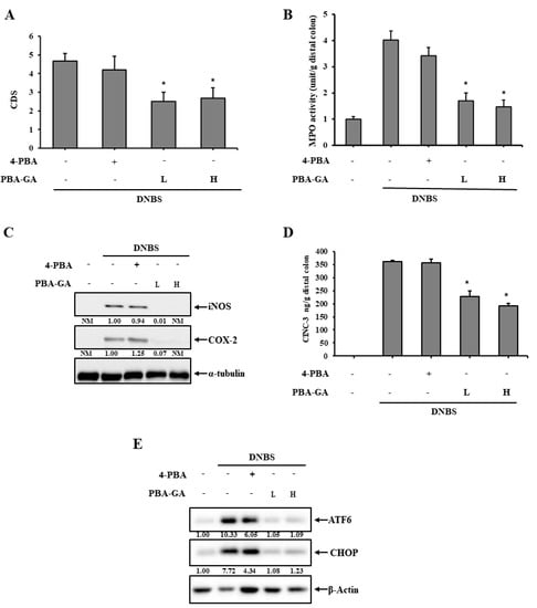 PBA-GA ameliorates 2,4-dinitrobenzenesulfonic acid (DNBS)-induced rat colitis by attenuating endoplasmic reticulum (ER) stress.(A–E) Three days after the induction of colitis, PBA-GA (17.9 (L) and 53.6 mg/kg (H), equivalent to 10 and 30.0 mg/kg of 4-PBA) dissolved in 1.0 mL of PBS (pH 7.4) was administered orally to rats once daily. The rats were sacrificed after the seventh dose. For comparison, 4-PBA (30.0 mg/kg) was administered in the same manner as PBA-GA. (A) The colonic damage score (CDS) was determined for each group, as described in the “Materials and Methods” section. (B) Myeloperoxidase (MPO) activity was measured in the inflamed distal colons (4.0 cm). Inflammatory mediators, including (C) iNOS, COX-2 and (D) CINC-3, were measured in the inflamed colon. α-Tubulin was used as a loading control to normalize the levels of iNOS and COX-2. (E) The levels of the ER stress marker proteins, ATF6 and CHOP, were monitored in the inflamed colon. β-Actin was used as a loading control to normalize the levels of ATF6 and CHOP. * p < 0.05 vs. DNBS control, NM: not measurable. The data represent the means ± SD (n = 5).