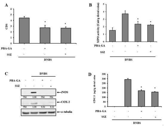 SSZ, a colon-targeted prodrug of 5-aminosalicylic acid (5-ASA), is an anti-inflammatory drug used clinically for the treatment of mild to moderate IBD. Thus, the anti-colitic effects of PBA-GA in the rat colitis model were compared to those of SSZ. SSZ (30.0 mg/kg) and PBA-GA (equivalent to 30.0 mg/kg of 4-PBA) were orally administered to the colitic rats once daily for 7 days. PBA-GA and SSZ reversed colonic damage and decreased MPO activity in the inflamed colonic tissues. PBA-GA was as effective as SSZ (Figure 4A,B and Figure S4). Moreover, the levels of inflammatory mediators, COX-2, iNOS, and CINC-3, were diminished in the inflamed colonic tissues with oral PBA-GA, and there was no significant difference in the anti-inflammatory effects between PBA-GA and SSZ (Figure 4C,D).