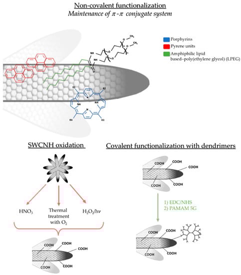 2.4. Non-Covalent and Covalent Functionalization of SWCNH